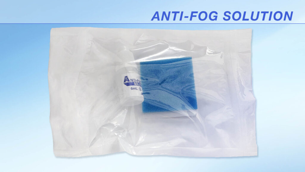 - Anti-Fog is safe, non-toxic and non-irritating, and conveniently packaged in a 6ml bottle with an adhesive foam pad/sponge (blue), for single patient use.